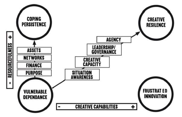 Wearing the black hat for a moment – there’s another more optimistic ‘asset-based’ view for another day on the positive elements of a reset - one can envisage a future where new companies are unable to flourish unless they hit the NPO (or equivalent) jackpot early. Many founders will be forced to operate in the ‘vulnerable dependent’ and ‘frustrated innovation’ quadrants of creative resilience for more of their time. More will grow exhausted before they are able to reach core-funded status. (Not that such funding is necessarily the panacea it might seem.)