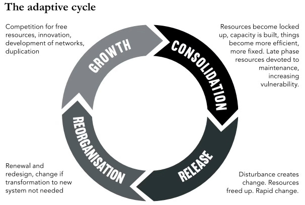 What we are seeing is, I think, an example of the adaptive cycle in action, at a sectoral level. If enough organisations enter the release phase at the same time – there is a related epidemic of artistic directors leaving their roles in major theatres, for instance – the system may start to tip so that the reorganisation phase is either distorted, or –potentially more positively – becomes a leap into a new system. This may have greater or lesser degrees of chaos inherent.